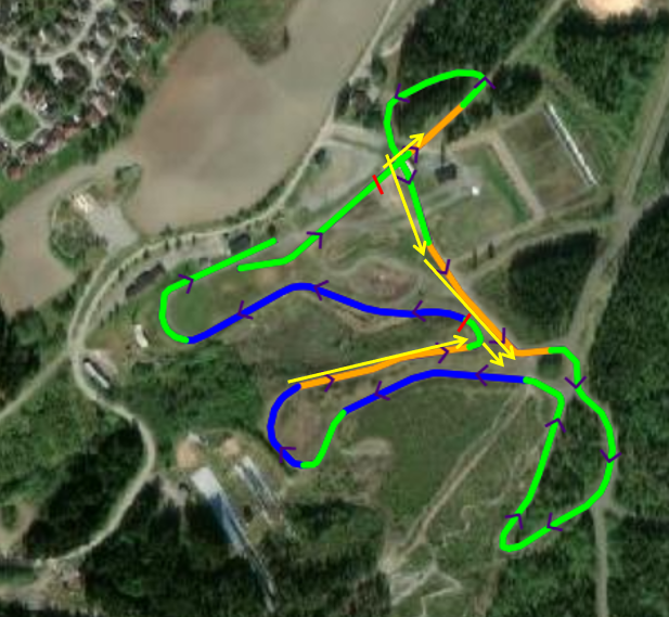 - Seks brede startspor, som går over i seks smalere spor mot "Øvre Bru", og deretter fire spor i alle motbakker. Tre spor i startene av nedoverbakkene, før sporet fjernes. Fem spor mot mål.