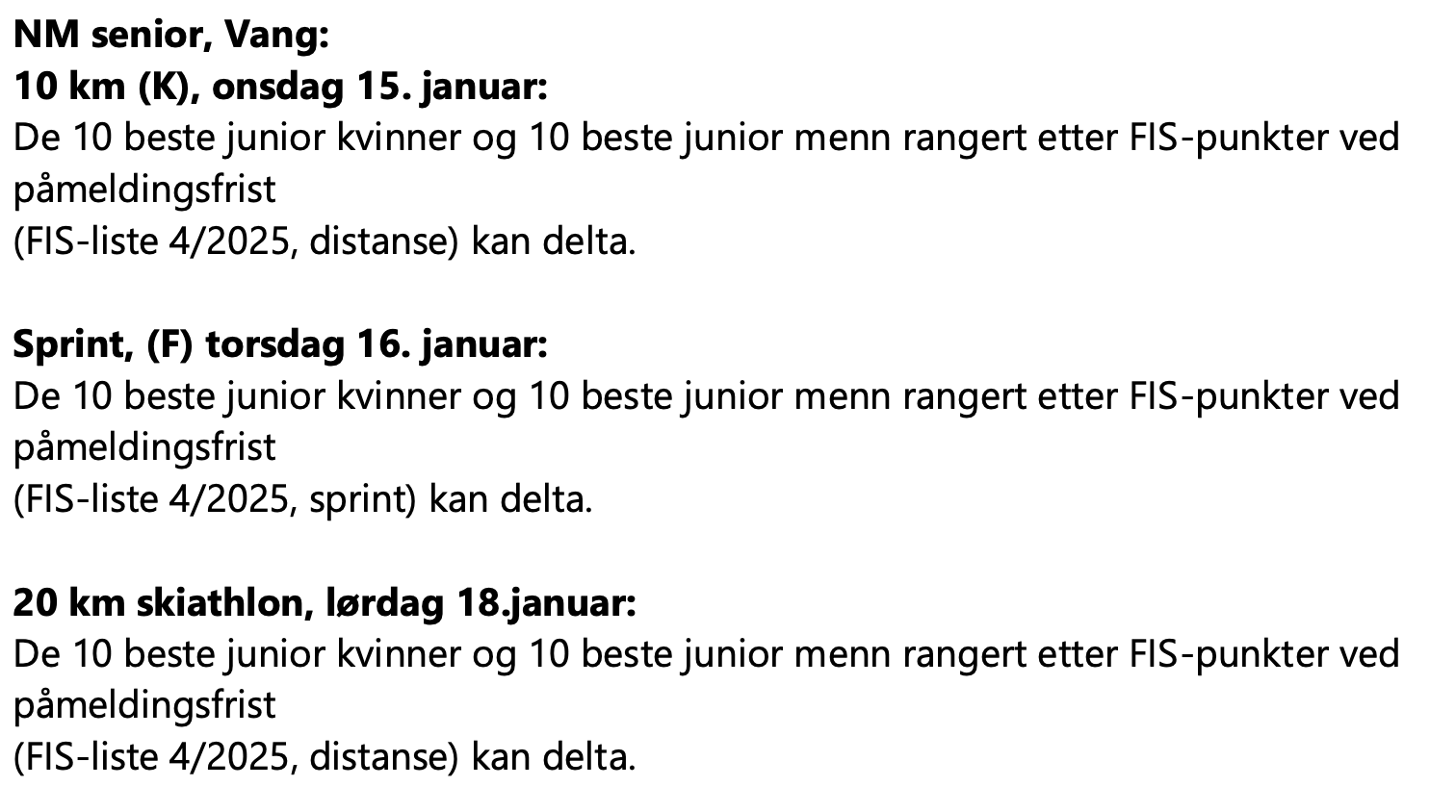 Vi gjør oppmerksom på at det er deltakerbegrensning i NM senior menn (langrenn), og viser til NSFs sesonginformasjon.