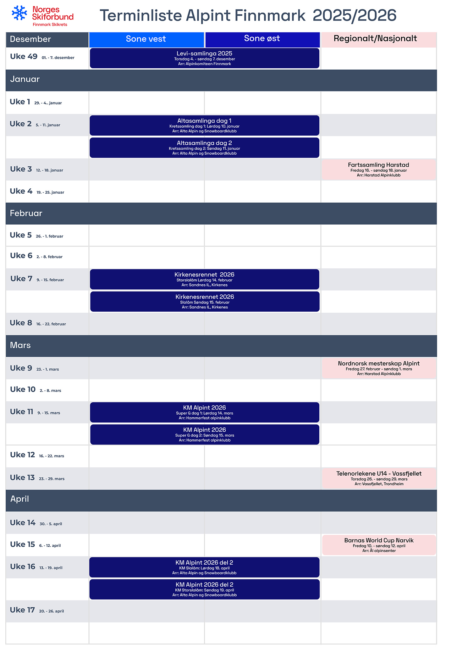 Det blir åpning med treningssamling i Levi i desember og finale med KM del2 i Alta i april. Sjekk alle alpinrenn kommende vinter her.