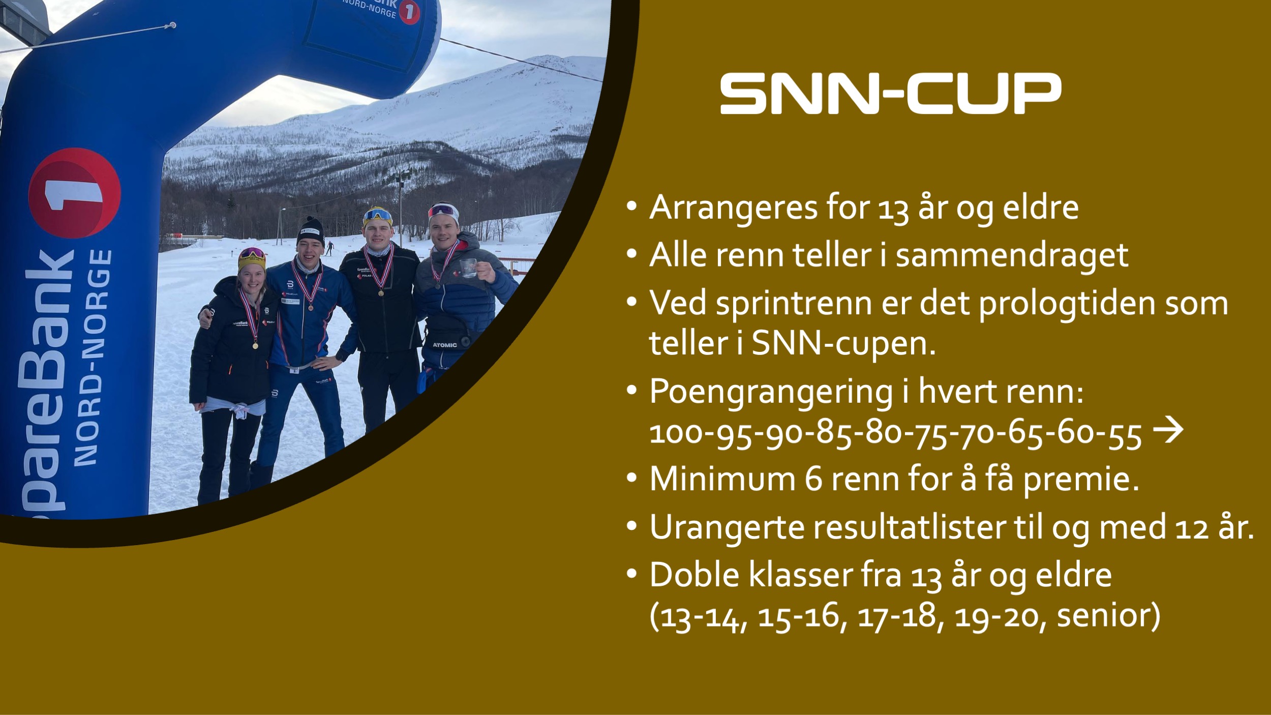 SNN-cupen er for 13 år og eldre. Alle renn teller i sammendraget. Det skal lønne seg å gå skirenn. Ved sprintrenn er det prologtiden som teller i SNN-cupen. Poengrangering i hvert renn: 100-95-90-85-80-75-70-65-60-55, osv... For å få premie sammenlagt må løperne ha gått 6 renn.
