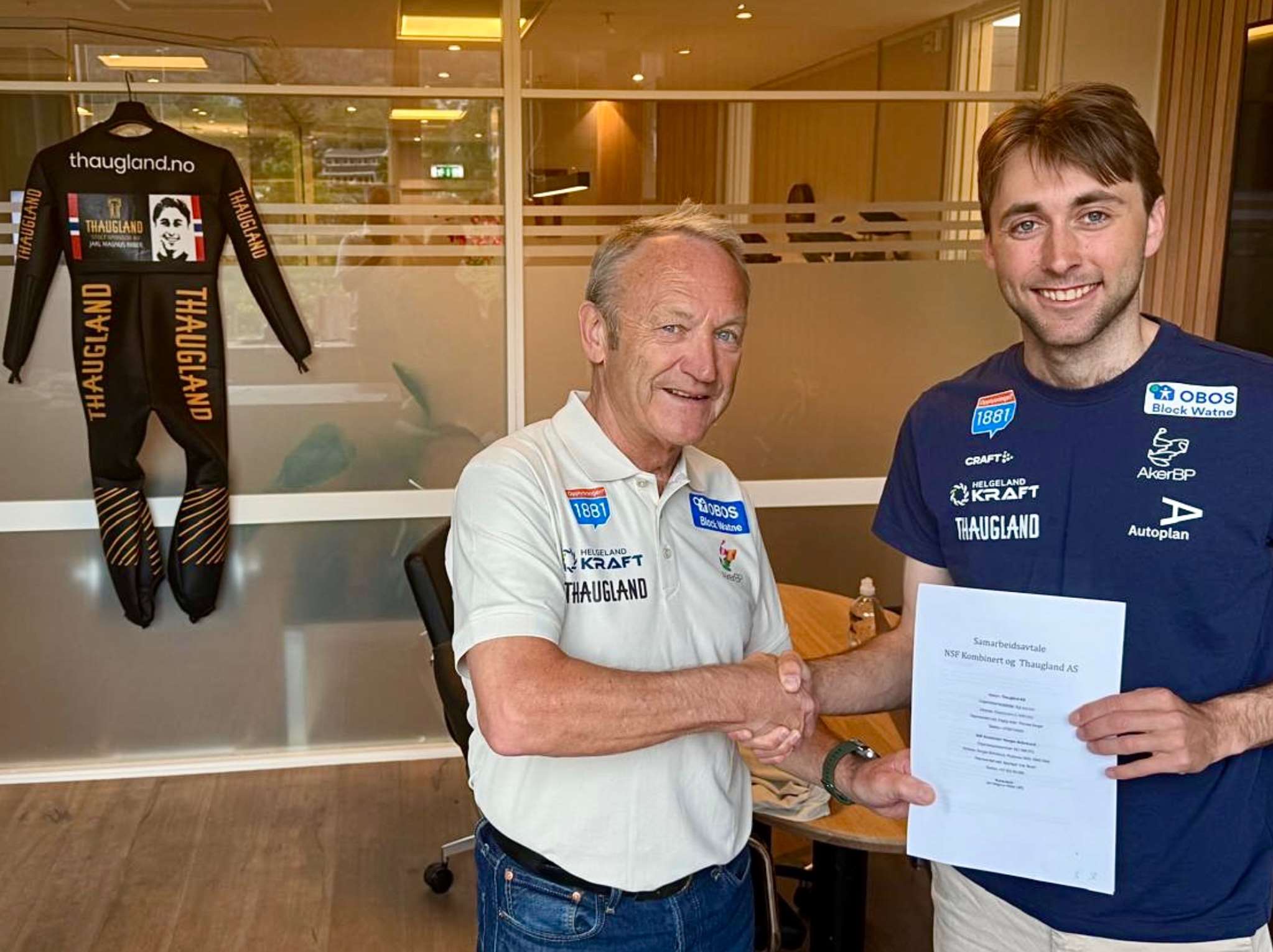 Mange vil kjenne igjen Thauglands logo fra Jarl Magnus Riibers konkurransetøy. Nå vil logoen dukke opp også på andre i den norske kombinertfamilien.