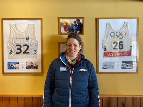Maria Giro med sitt startnummer fra OL på Lillehammer i 1994 til venstre