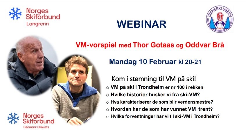 Norges Skiforbund i samarbeid med Hedmark Skikrets og Trenerklubben i langrenn ønsker velkommen til nytt Webinar, denne gangen med Thor Godtås og Oddvar Brå som tar oss gjennom en reise i VM historien.