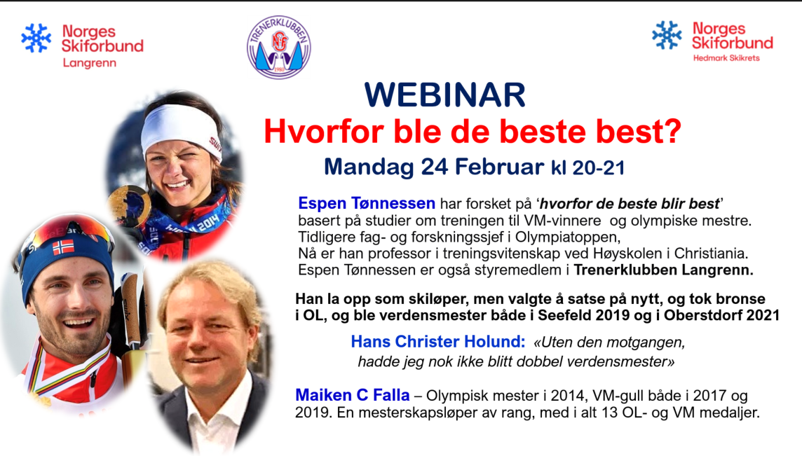 Norges Skiforbund i samarbeid med Hedmark Skikrets og Trenerklubben i langrenn ønsker velkommen til nytt Webinar, denne gangen med Esppen Tønnesen, Hans Christer Holund og Maiken Caspersen Falla på gjestelisten.