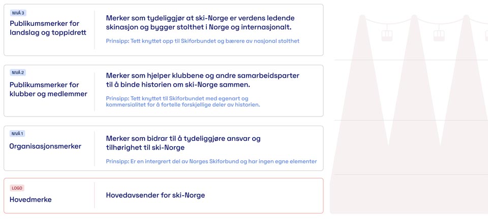 Merkevaren skal hjelpe alle Skiforbundets ansatte, tillitsvalgte, frivillige og samarbeidspartnere å forvalte historien om skisportens og skikulturens store betydning for landet i nåtid og fremtid. Målet er å bygge et enda sterkere felleskap på tverr av utøvere, klubber, kretser, grener og støttespillere, fra bredde til topp, og fra sør til nord.