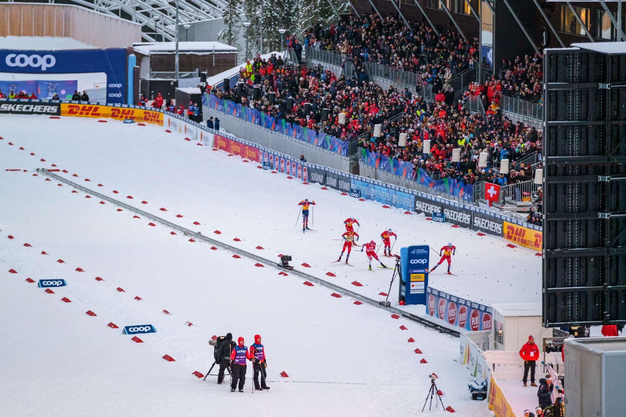 Emil Iversen veksler med Johannes Høstflot Klæbo t.h. under sprint lag kvalifisering i ski-VM i Seefeld. Bak ser vi Dominik Baldauf og Max Hauke t.v.