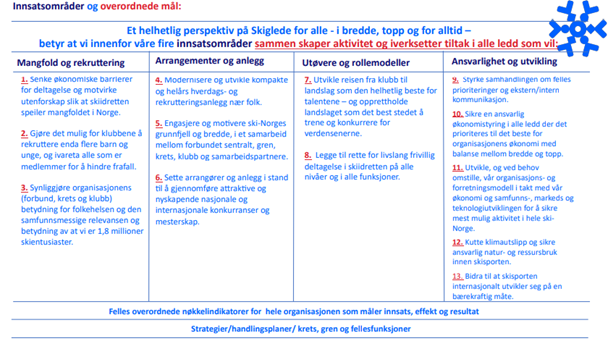 I Norges Skiforbund sitt strategidokument “Skiforbundet vil”, vedtatt på Skitinget 2024, er det 13 innsatsområder for å nå overordnede mål. Disse må sees på som overordnede og ikke direkte gyldige for arbeidet i klubb og krets. Men de gir en retning for hvilke hovedmål handlings- og tiltaksplaner skal bidra til å oppnå.