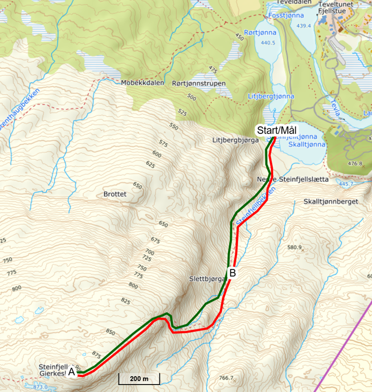 U18 – U20                  ca. 750 høydemeter              Start – A – B – A – Mål