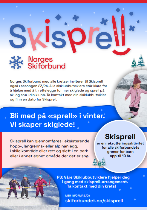Norges Skiforbund med alle kretser inviterer til Skisprell kommende vinter. Alle skiklubbutviklere står klare for å hjelpe med å tilrettelegge for mer skiglede og sprell på ski og snø i din klubb. Ta kontakt med din skiklubbutvikler og finn en dato for Skisprell.