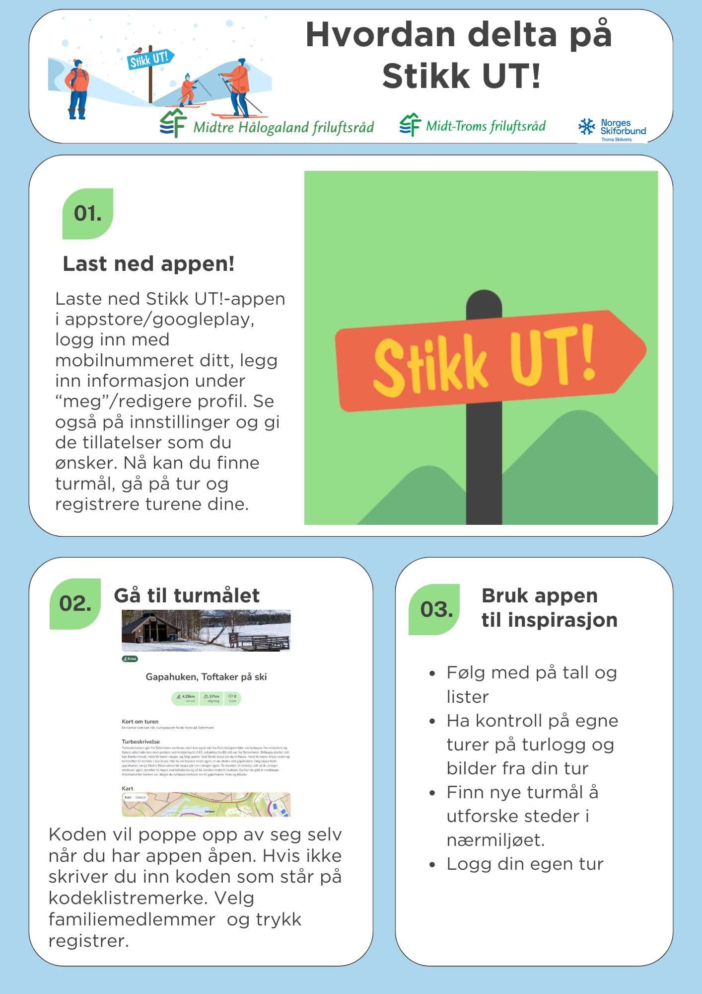 De ulike turene kan enkelt og sømløst finnes på Stikk Ut! sin app, link nedenfor. Der kan du finne inspirasjon til nye turer og enkelt registrere turer på farta! Turene er klassifisert etter vanskelighetsgrad fra grønt, blå, rød og svart. Hvor grønn er de letteste turene og svart krever både god kondis, varmt drikke på termosen og kvikk-lunsjen i sekken!