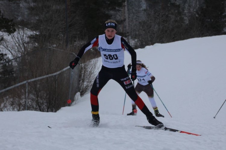 På søndag ble det arrangert 3 km fristil, og nok en gang ble det leverte gode prestasjoner. Viktor Schelver Tangen tok en 13.plass i G13. Elise Nauf Borgersen tok en 20.plass i J13. Ole Kristian Tjønnås leverte en 19.plass i G14 og Mari Borgersen Bjaadal ble nummer 30 i J14. På bildet ser vi IF Ørns Ingrid Aarhus Kinn (Foto: Terje Bakke) i godt driv opp siste del av Kapellbakken.